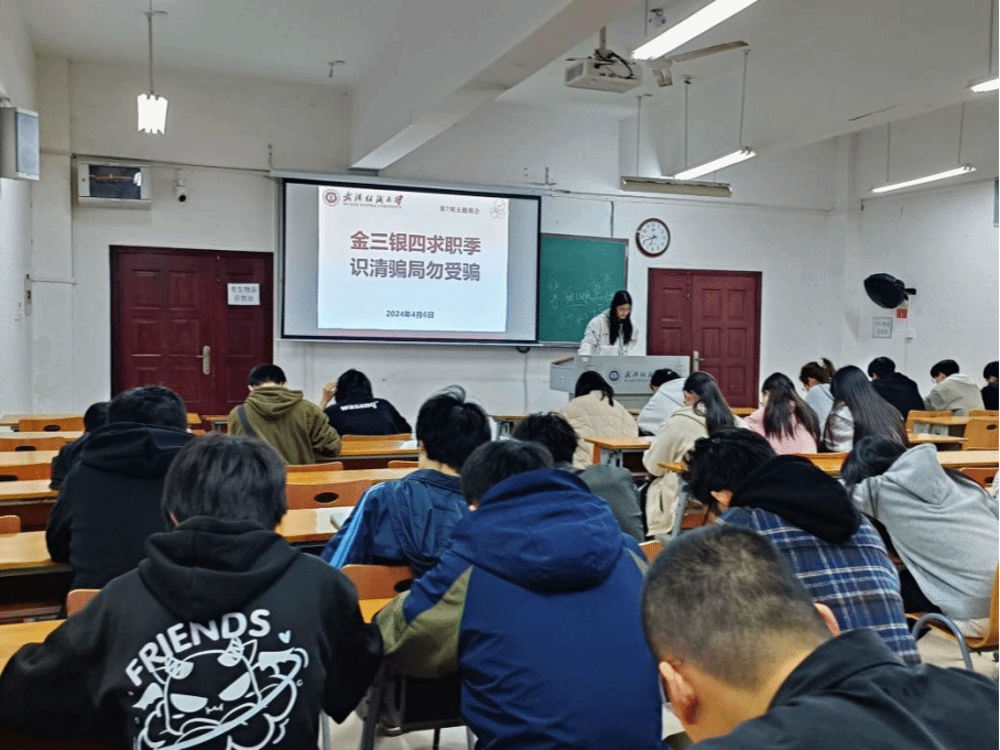 最后,班长介绍了主题班会的最后一个主题“金三银四求职季,识清骗局勿受骗”,向同学们介绍了各种各样存在于求职过程中的诈骗方式,帮助同学们早了解早防范。