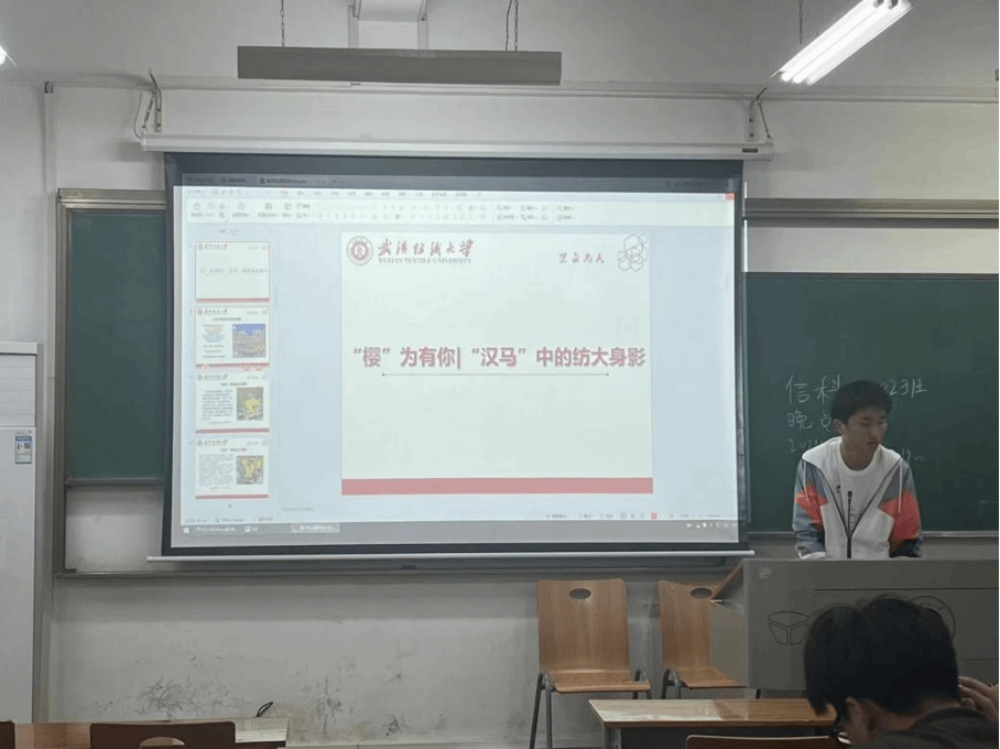 随后,各班班长向大家介绍了“汉马”中的纺大身影,向同学们介绍了今年武汉马拉松里的纺大身影,让同学们看到了纺大的老师、同学们对于体育的热情,对跑步的热爱,以及对英雄武汉的喜爱和自豪。同时还展现出他们自律、坚韧、向上的品格。