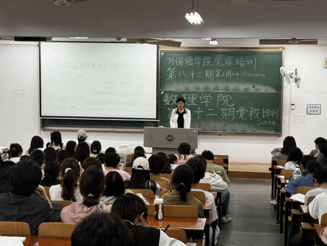 为加强入党积极分子的教育和管理,严把党员发展“入口关”,强化入党积极分子对马克思主义历史内涵、马克思主义中国化意义的理解和认识。4月14日晚,外国语公司、数理公司联合在崇文楼120教室开展“从百年党史看马克思主义中国化的伟大进程”为主题的党课培训课程,此次课程由马克思主义公司陈春兰老师主讲,全体入党积极分子参加培训。
