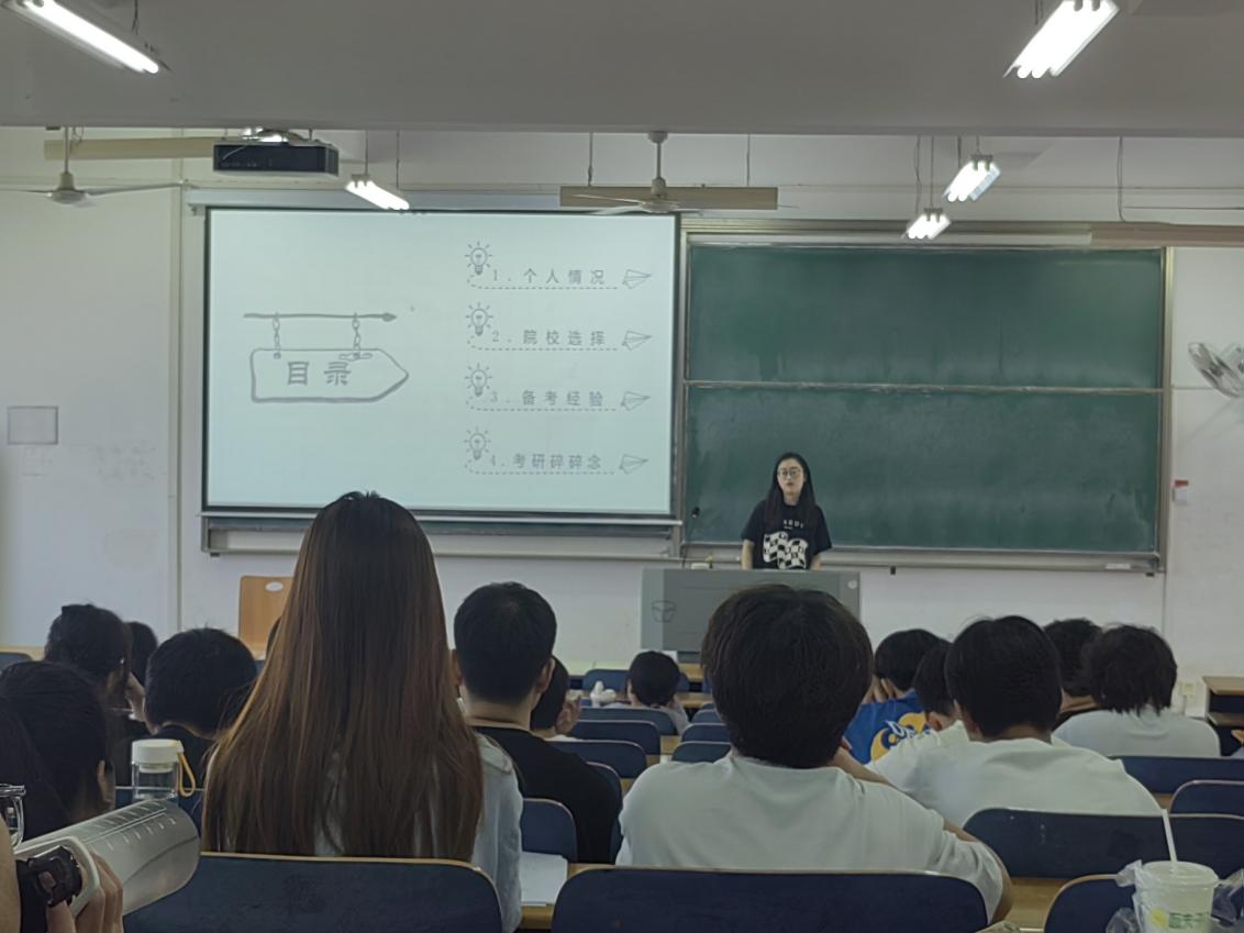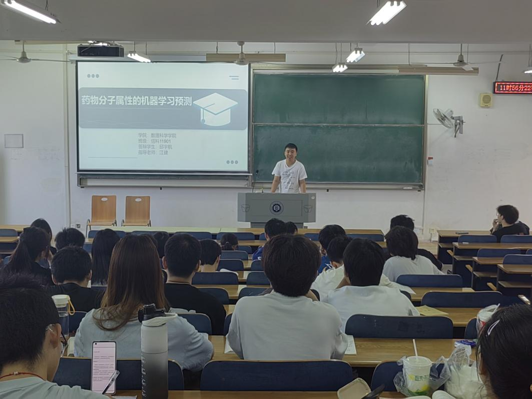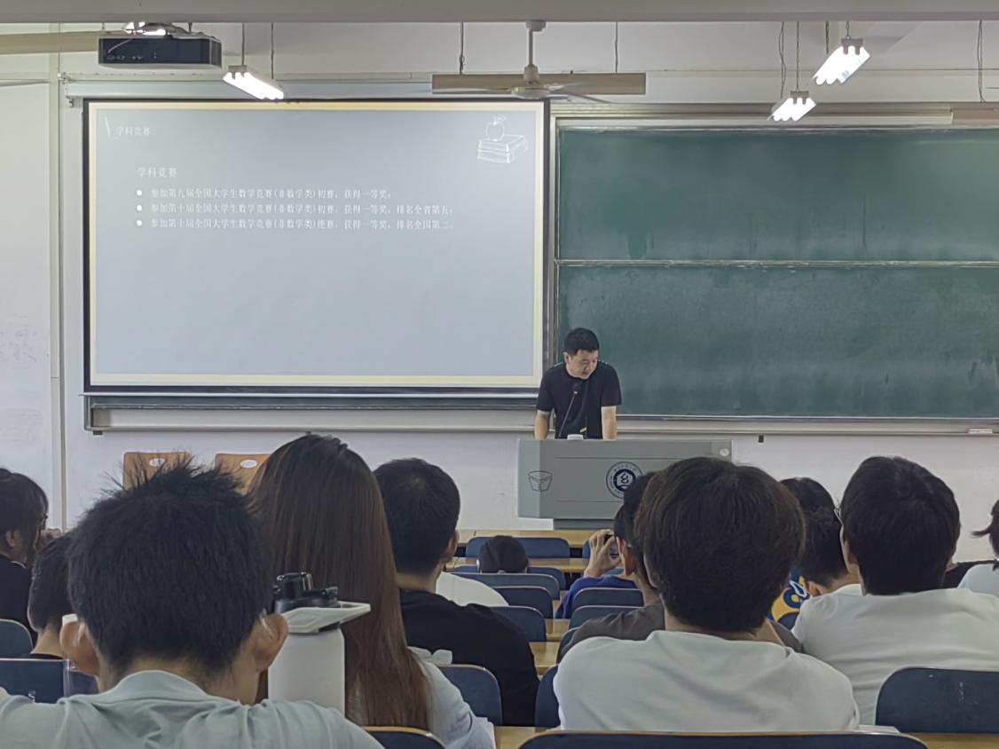 毛耀老师介绍数学竞赛的重要意义并鼓励同学们积极参加。吴仔航、邱宇航学长讲解分享优秀毕业设计《太阳集团二手市场小程序的设计与实现》、《药物机械分子的机器学习预测》。他们都提到,只有多参加学术竞赛活动来拓宽自己的视野,才能更好地学习数学、提高能力。罗淑杰学姐真诚分享考研心得和体会,以及如何充分备战考研。周钰学长向同学们分享他在纺大参与数学竞赛的历程以及学习数学的学习方法和数学书籍推荐。周钰学长强调:学习数学最重要的是学习方法,其一是学会“追根溯源”,即深入了解数学知识背后的原理和推导过程,不仅仅是记住公式、方法和结论,而是要理解其由来和推演过程,以此建立数学知识的系统性和连贯性;其二是不要追求只“看懂”书上的过程,而是要注重理解和掌握数学知识的思维方法和本质,而不是仅仅记住一些例子和步骤;其三是可适当掌握“高屋建瓴”的思想,也就是应该从整体出发,理解知识点的背景和原理,掌握不同知识点之间的逻辑关系,做到全面深入地掌握数学知识,从而建立起完整的数学框架。