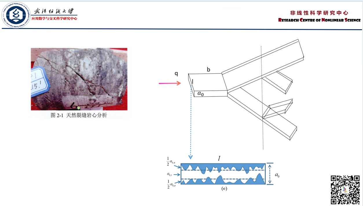 王瑞瑞:本次汇报了近期的研究进展,在应力作用下树状分叉网络裂缝的热导率分形分析。树状分叉网络拥有自相似和分形特征,使其在传热和流体流动方面具有独特的优势。在本研究中,我们专注于Y形的树状分支网络,其中我们假设裂缝呈矩形形状,并且每个分支都是矩形的。本次研究的主要内容是考察在受到应力压缩后,软部分迅速发生压缩,而硬部分则极难压缩。当应力达到约400MPa时,矩形裂缝网络不再发生压缩,同时热导率基本不再发生变化。