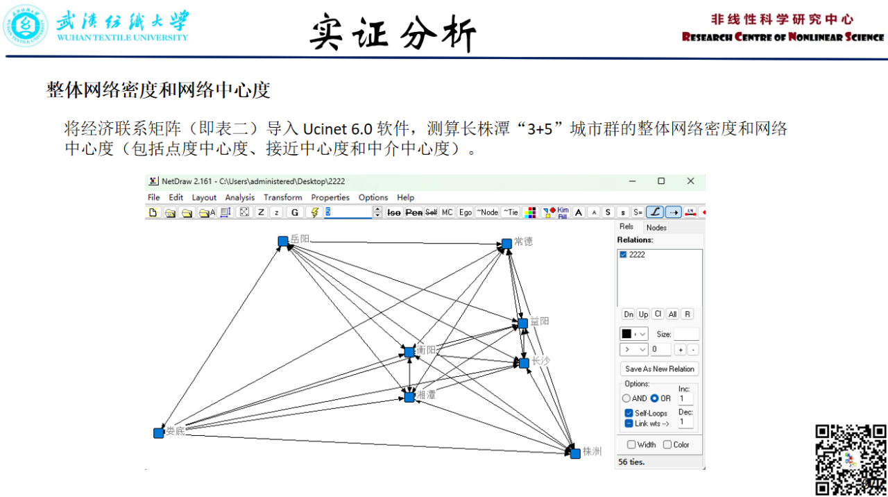 黄加阳:本次汇报了一篇名为《基于社会网络分析的长株潭“3+5”城市群经济网络结构研究》的文献。长株潭“3+5”城市群是湖南省经济上紧密联系、功能上分工合作的城市聚合体。为了更好地构建区域经济格局,更为全面而清晰地把握单个城市之间、单个城市在城市群中以及城市群整体网络的真实关系,运用社会网络分析法和城市引力模型,对长株潭“3+5”城市群的经济联系强度、网络密度、网络中心度、核心-边缘结构等指标进行定量化实证研究。研究结果表明:长株潭“3+5”城市群整体网络密度高,8个城市间经济联系非常紧密;网络中心度较高,城市群网络化结构明显;整个城市群处于非均衡发展状态,具有明显的核心-边缘结构特征;凝聚子群之间处于较弱连接状态。鉴于此,亟须进一步大力推进长株潭三市一体化建设、推动区域性中心城市建设。提高城市群内部主体关联度和建立良好的信息共享机制是优化长株潭“3+5”城市经济网络结构的有效途径。最后展示了关于UCInet6.0这一社会网络分析软件的使用。