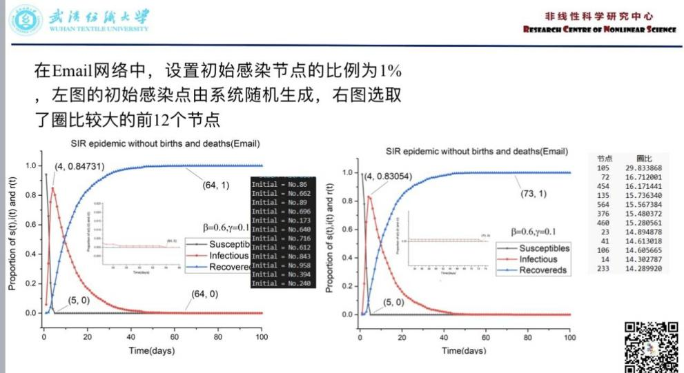 杨凤鸣:本周汇报的是近期工作,本次汇报了基于SIR模型,类比疾病传播过程,研究网络中病毒的传播。选取圈比这个指标对节点进行重要性排序后,可以比较在不同的初始感染节点下病毒的传播过程,通过选择具有高影响力的节点作为初始感染者,在SIR传染病模型中可以最大限度地扩大疾病的传播范围,从而有针对性的抑制疾病传播.