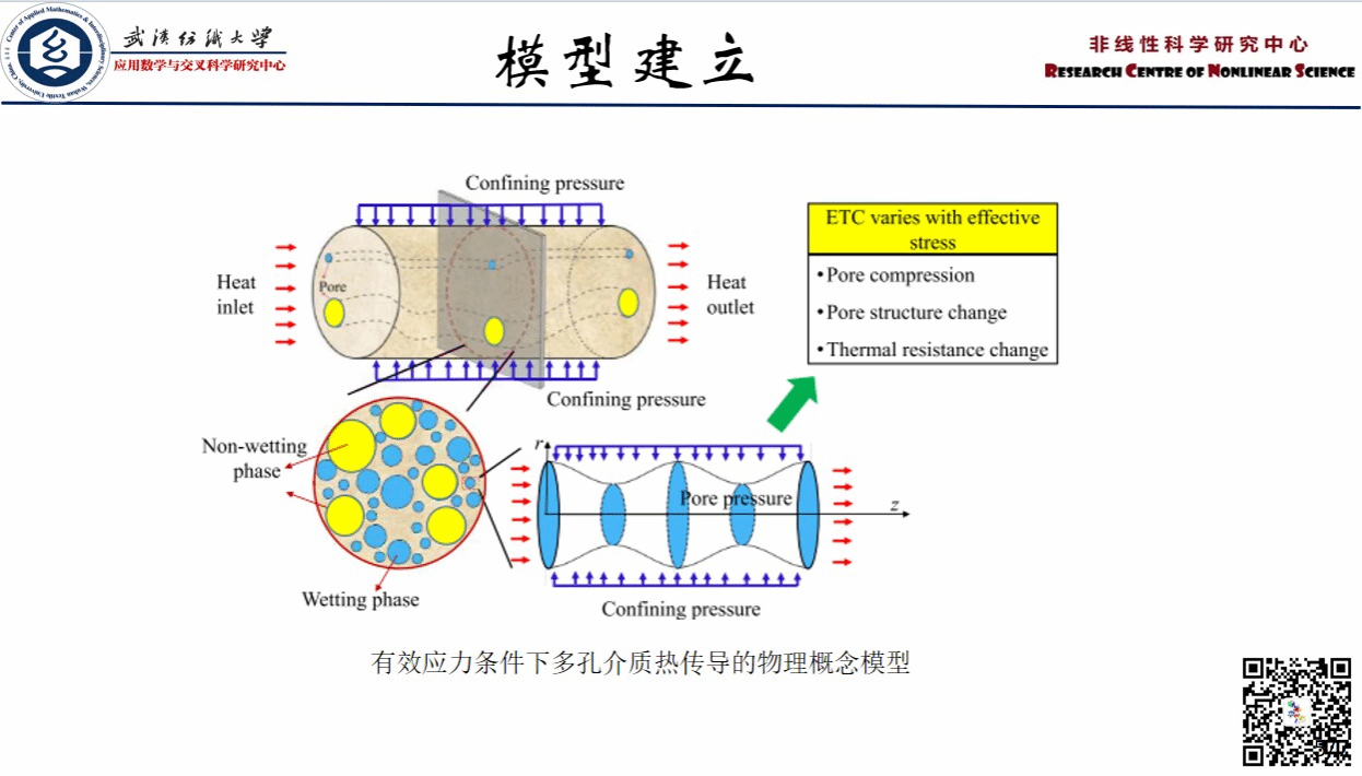 王瑞瑞:介绍了一个综合的模型,用于探究多孔材料在不同应力条件下的有效导热系数(ETC)。该模型通过与实验数据的比较得到了验证,表现出良好的性能。根据这一模型,ETC受多个物理参数的影响。研究结果表明,在低有效应力条件下,随着有效应力的增加,ETC和润湿相饱和度显著增加。然而,随着有效应力的进一步增加,ETC保持稳定。此外,ETC随着润湿相饱和度的增加而增加,但随着初始有效孔隙率、半径波动幅度或相对粗糙度的增加而降低。这一研究旨在更深入地理解多孔介质在不同应力和润湿相饱和度下的ETC变化,强调了这两个参数的综合影响。所提出的模型不仅有助于确定数值模拟中的ETC值,还可以为多孔介质中的热传导过程提供准确的预测,有望在各种应用中发挥关键作用。