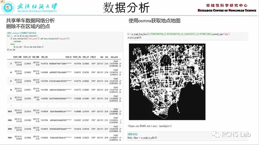 穆添歌 :今天汇报了通过深圳市政府数据开放平台获取的深圳市共享单车企业每日订单表,通过分析这个数据并结合路网信息,将其可视化,可以用于共享单车的调度和管理,例如确定车辆的需求热点和盲点,为车辆的投放和调度提供数据支持。 并结合路网信息,将其可视化。此外也可以用于城市规划、拥堵预测以及智慧出行等领域。