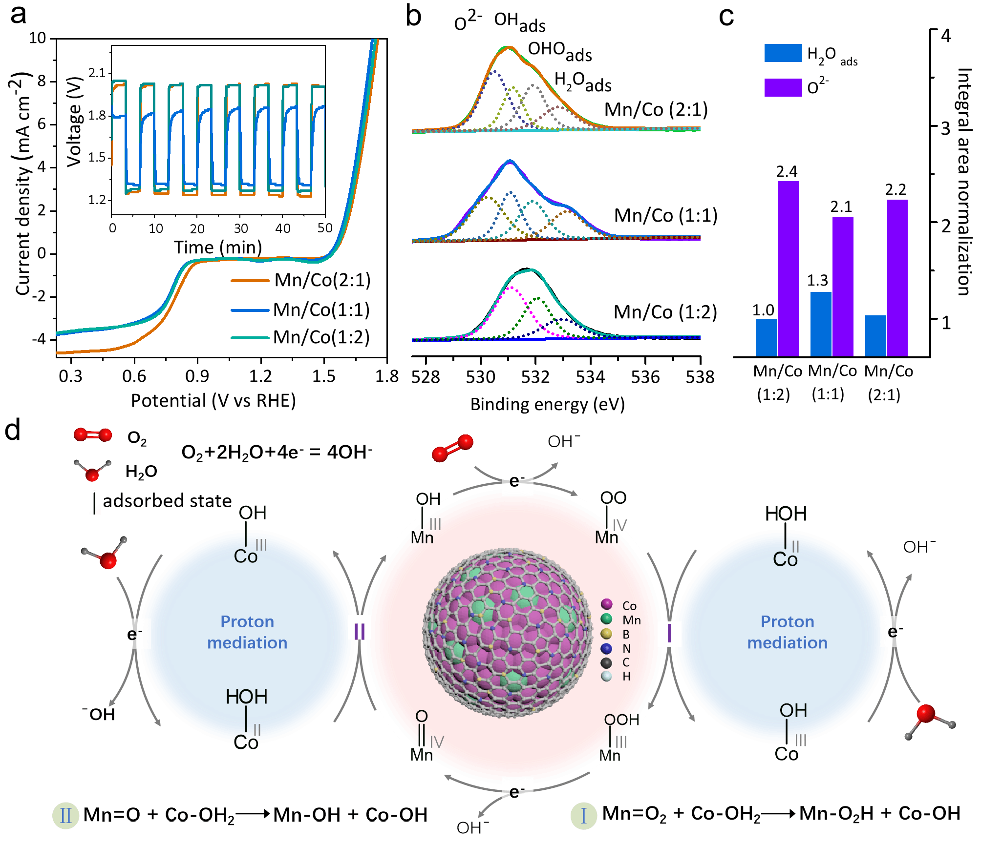 图1. 准固态锌空气电池Mn/Co-BNC电催化剂表面氧气和水活性机理分析