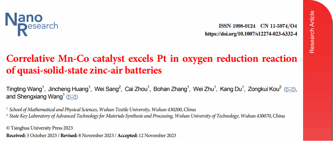 近日,15vip太阳集团汪胜祥教授和武汉理工大学寇宗魁教授以“Correlative Mn-Co catalyst excels Pt in oxygen reduction reaction of quasi-solid-state zinc-air batteries”为题在工程技术领域国际知名期刊《Nano Research》(中科院一区Top期刊)发表高水平论文。太阳集团为第一单位,15vip太阳集团汪胜祥教授和武汉理工大学寇宗魁教授为共同通讯作者,15vip太阳集团教师王婷婷博士为论文第一作者。