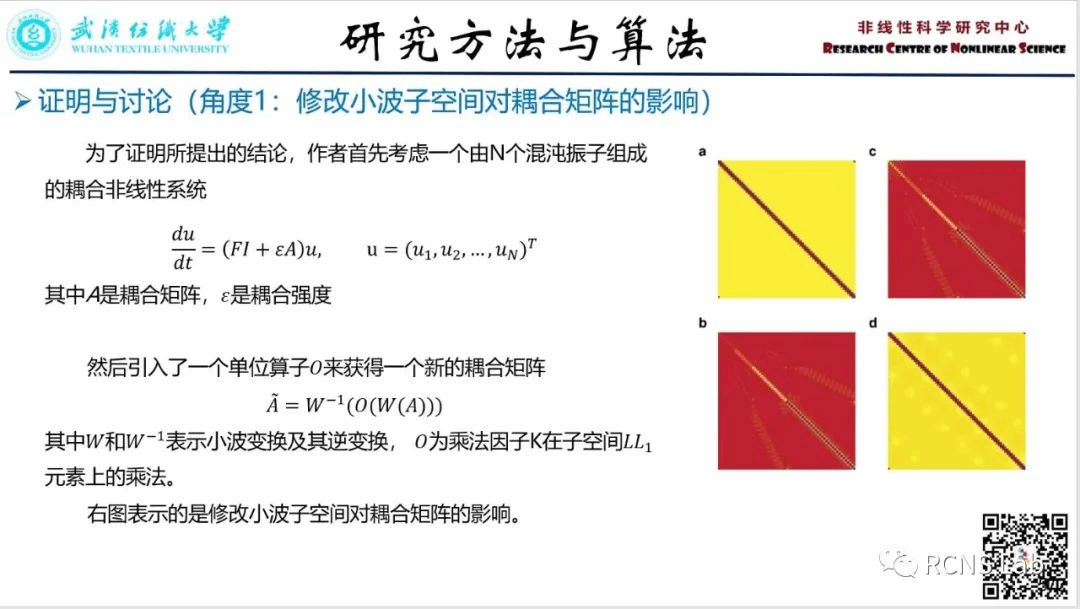 张春焕:本次汇报了一篇文献《Tailoring Wavelets for Chaos Control》。小波理论作为一种分析工具,在非线性动力学中得到了广泛的应用,但其使用仅限于分析和表征。直接使用小波作为控制系统动力学的基础还没有得到开发,本文的目的就是介绍一个使用小波进行混沌控制和同步的新范式,研究发现,通过修改耦合矩阵小波子空间的一小部分就可以显著增强混沌系统中同步流行的横向稳定性。