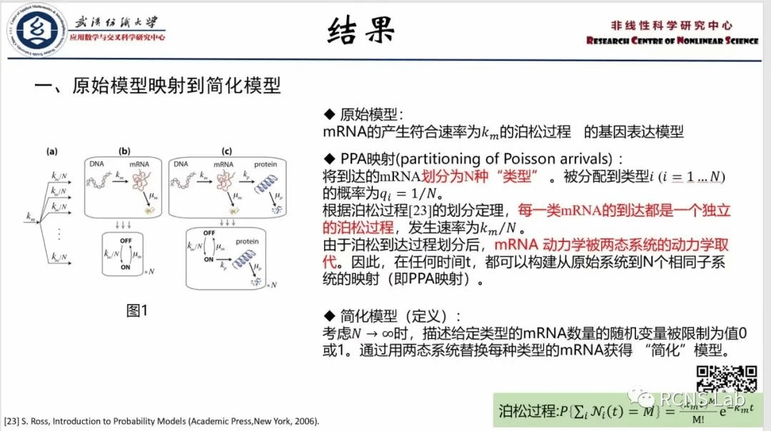 郭贞贞:本次汇报了一篇文献《Exact protein distributions for stochastic models of gene expression using partitioning of Poisson processes》。基因表达的随机性导致基因相同的细胞群体中蛋白质水平的波动。这种波动可导致克隆群体的表型变异,因此,人们对使用随机模型量化基因表达中的噪声有相当大的兴趣。然而,除了最简单的模型外,获得蛋白质分布的精确分析结果是个复杂的工作。在这里,文章调用泊松过程的划分特性来构建一个映射,简化了基因表达随机模型的分析。通过使用基于启动子调控的模型中mRNA分布的结果,该映射导致精确的蛋白质分布。文章中使用这种方法导出了基因表达的基本两阶段模型稳态的时间依赖分布的精确分析结果。此外,文章还展示了扩展两阶段基本模型之后的精确分布,包括转录后和翻译后调控的影响。
