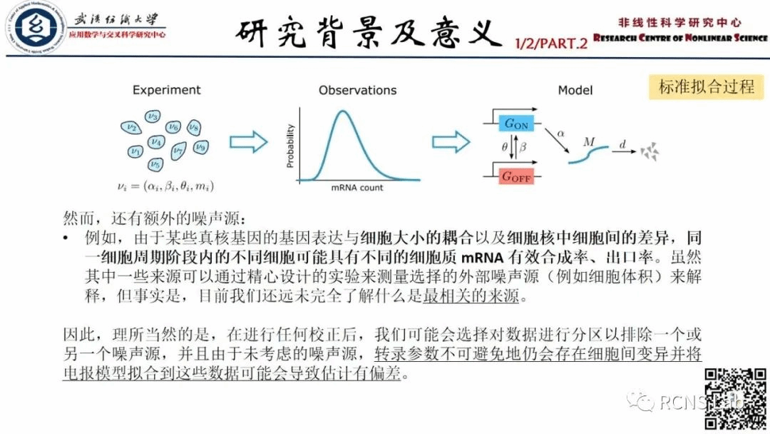 张秋玉:本次组会汇报了一篇文献《Quantifying and correcting bias in transcriptional parameter inference from single-cell data》。每个细胞mRNA计数的快照分布可以使用单分子荧光原位杂交或单细胞RNA测序来测量。这些分布通常适合于两态电报模型的稳态分布,以估计感兴趣的基因的三个转录参数:mRNA合成率,开启率(开启状态为活性转录状态)和关闭率。该模型假设没有外部噪声,即参数在细胞之间不变化,因此估计的参数应被理解为近似于总体中的平均值。这种近似的准确性目前尚不清楚。在这里,作者发展了一个解释了使用标准电报模型从单细胞数据推断参数时估计偏差的大小和符号的理论。发现特定的偏倚特征取决于外部噪声的来源(该参数在细胞间变化最大)和转录活性的模式。因此,在输入到基于电报模型的推理框架之前,对数据进行外部噪声校正是很重要的,因为这种类型的噪声可能会显著影响参数估计。
