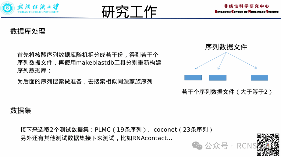 郭成:本次汇报了RNA残基接触预测的相关工作,在原有核酸序列数据库的情况下,首先将核酸序列数据库随机拆分成若干份,得到若干个序列数据文件,再使用makeblastdb工具分别重新构建序列数据库;为后面的序列搜索做准备,去搜索相似同源家族序列。其中先选取2个测试数据集:PLMC(19条序列)、coconet(23条序列),以及在RNA数据集上进行阶段测试结果。