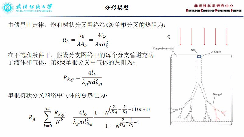 邹浩谦:本次汇报了一篇文献《FRACTAL MODEL FOR EFFECTIVE THERMAL CONDUCTIVITY OF COMPOSITE MATERIALS EMBEDDED WITH A DAMAGED TREE-LIKE BIFURCATION NETWORK》。这篇文献基于分形理论和热电模拟方法,研究了嵌入损伤树状分叉网络的不饱和复合材料的有效热导率。研究发现:长度分布的分形维数、损伤通道数、分叉级数与液相饱和度对有效热导率有显著影响。该研究丰富了多孔介质热输运理论,并对工程问题有一定的指导意义。