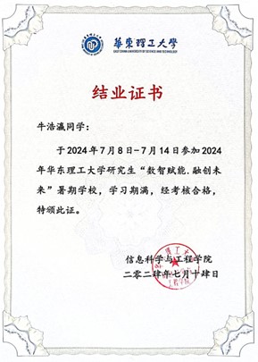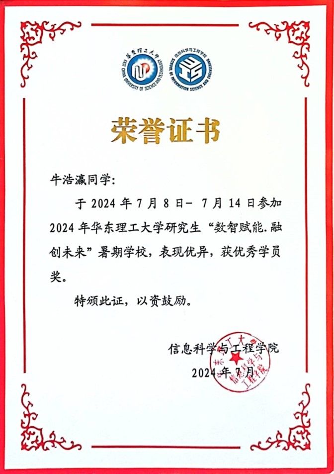 2024年7月8日至7月14日期间,公司牛浩瀛同学前往华东理工大学参加“数智赋能. 融创未来”研究生暑期公司。整个暑期公司涵盖专家专题学术报告、学术论坛、学员破冰活动、现场参观和交流讨论等丰富内容。在此次活动中,牛浩瀛同学聆听了多位专家的讲座,与老师和同学们进行了交流,既了解了数字化和智能化技术在相关领域的融合创新,拓宽了学术前沿的视野,也进一步提升了学术水平和实践能力;同时,牛浩瀛同学还获得此次研究生暑期公司“优秀学员奖”。